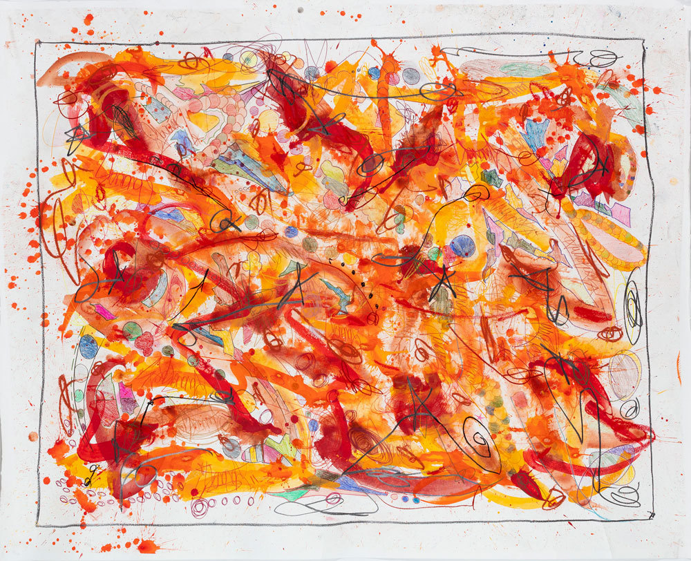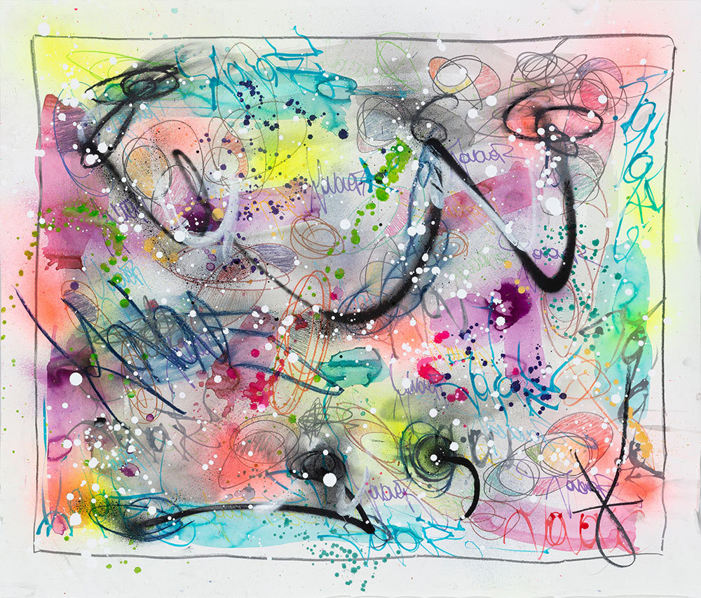 Encre, aérosol, crayon gras et pastel sur papier